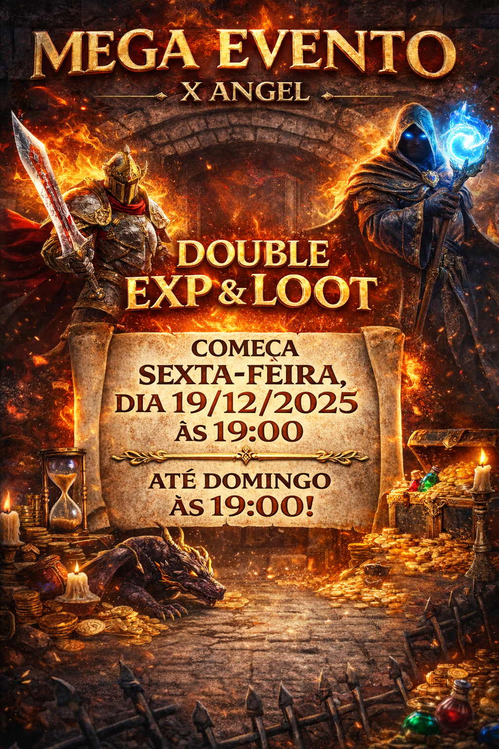 🛡️🔥 O Grande Chamado das Terras de X Angel! 🔥🛡️A partir desta Sexta-feira, 19 de Dezembro, às 19:00h, os céus se abrem e uma poderosa bênção recai sobre todo o continente: Durante este período, heróis e aventureiros sentirão suas habilidades florescerem em ritmo acelerado, enquanto criaturas tombarão deixando riquezas jamais vistas. 📜 Início: Sexta-feira — 19/12/2025 às 19:00h Erga sua espada, prepare suas runas, convoque seus aliados e marche rumo à glória.